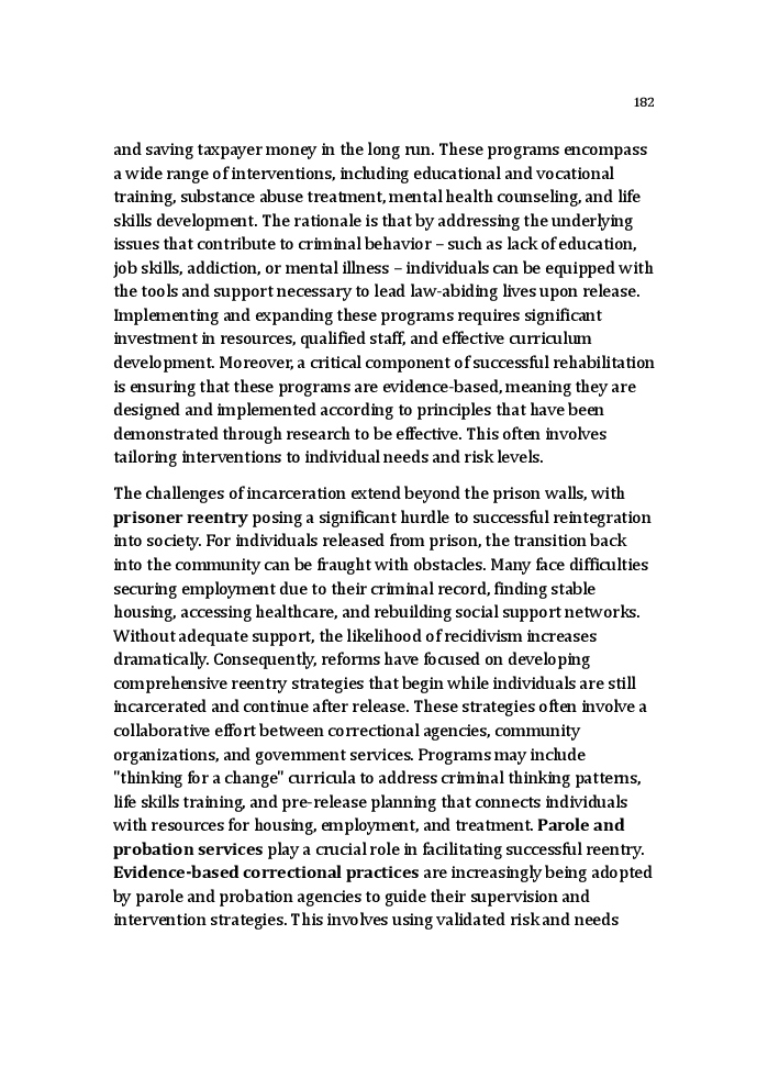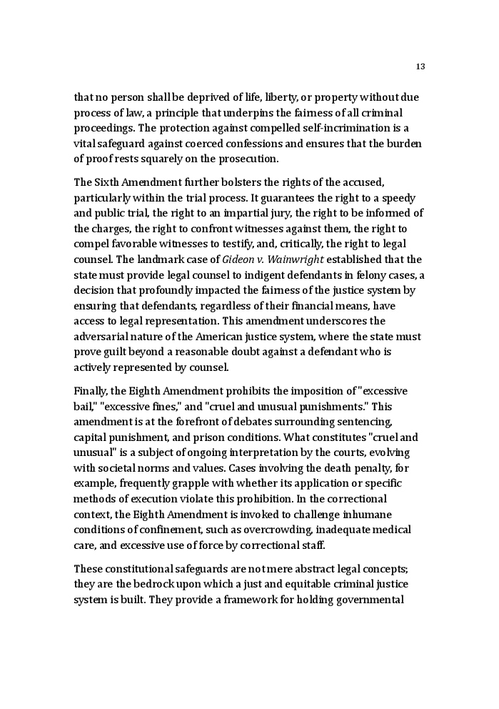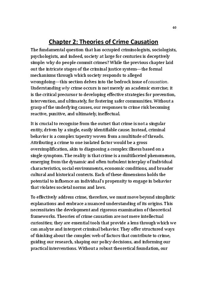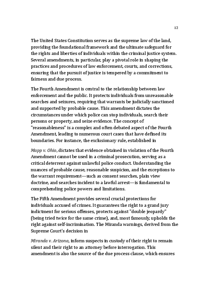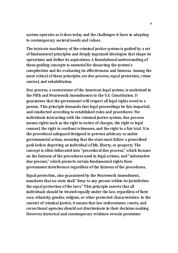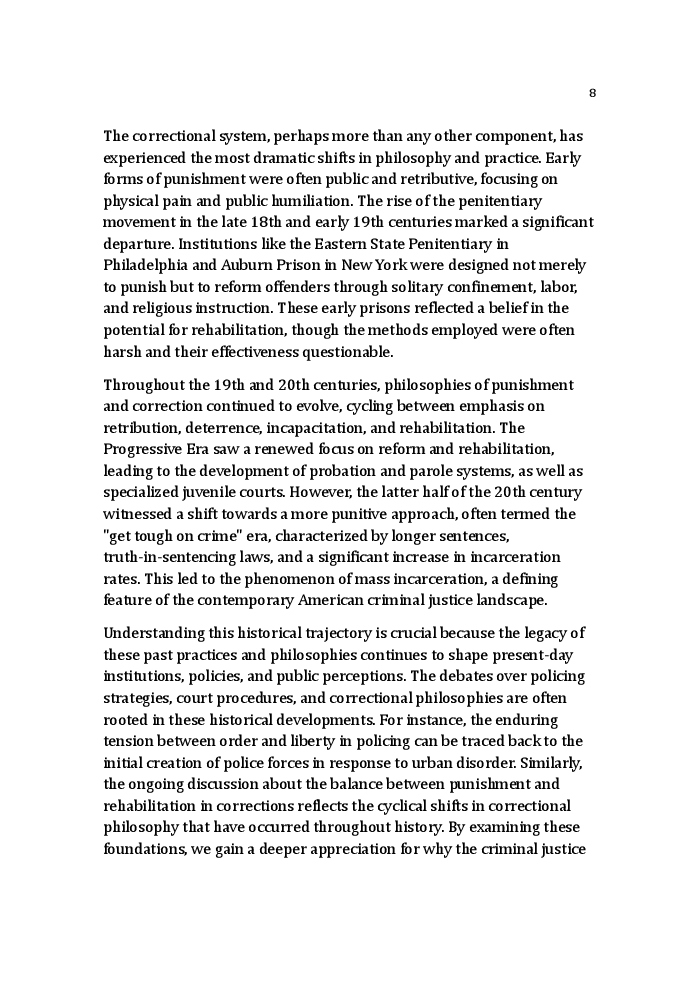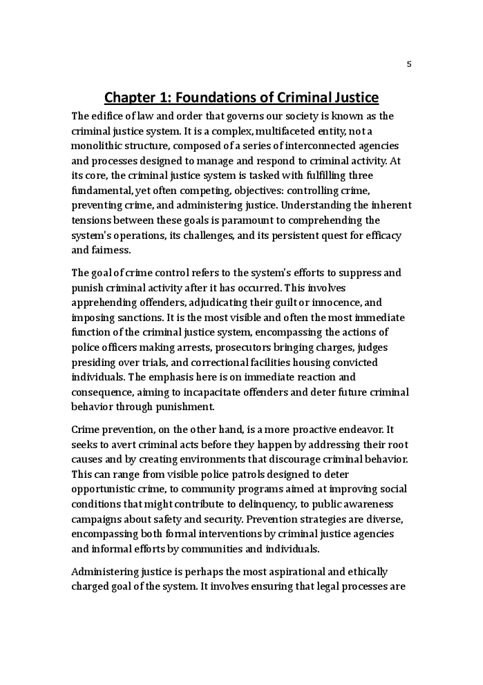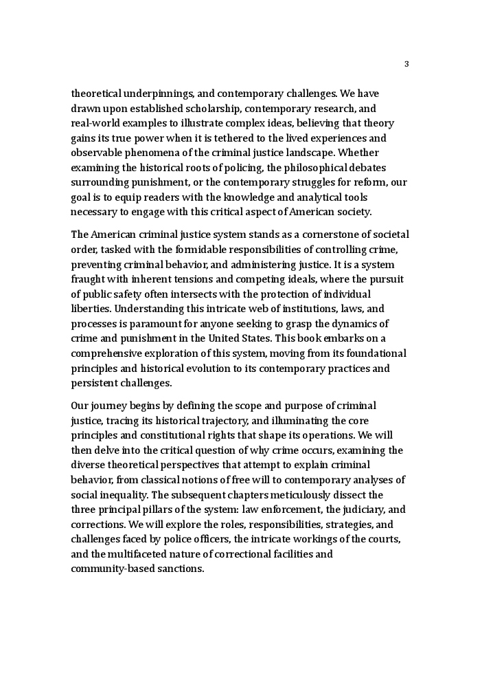 This book serves as an introduction to the field of criminal justice, aimed at anyone interested in understanding the complex systems of law enforcement, the judiciary, and corrections. The book provides a foundational understanding of the criminal justice process, the theoretical frameworks that guide it, and the practical implications of criminal justice policies.