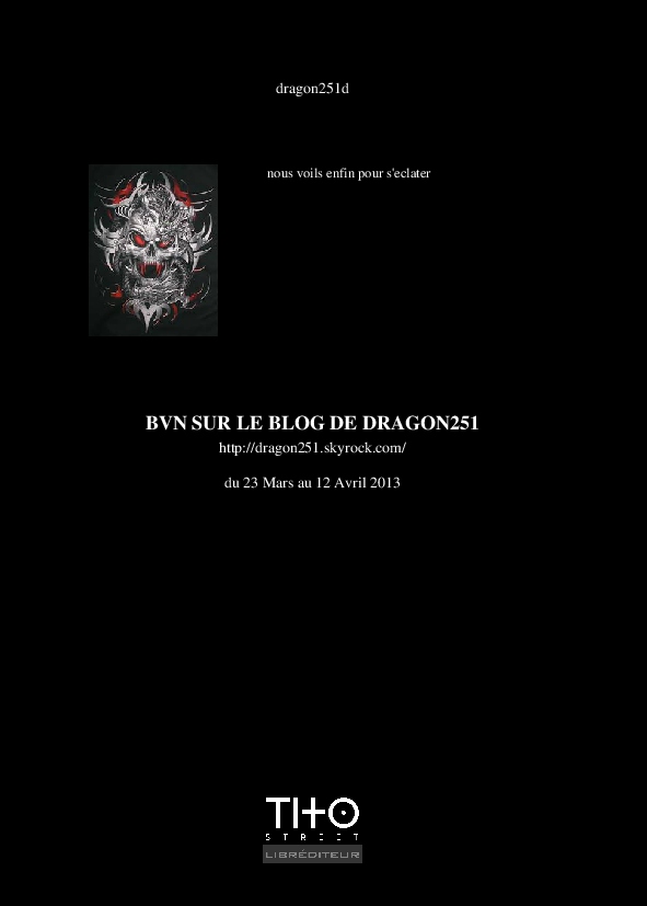 dragon251d made the blook of their their blog Skyrock ! Support their creativity by buying their blook or create your own now on BlookUp!