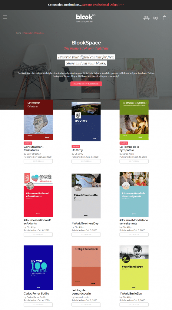 The BlookSpace is a unique marketplace for storing and protecting your digital data. In just a few clicks, you can publish and sell your Facebook, Twitter, Instagram, Tumblr, blog or PDF book, and share it with your community!