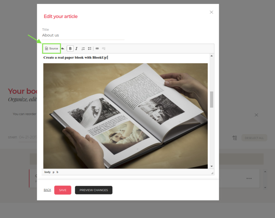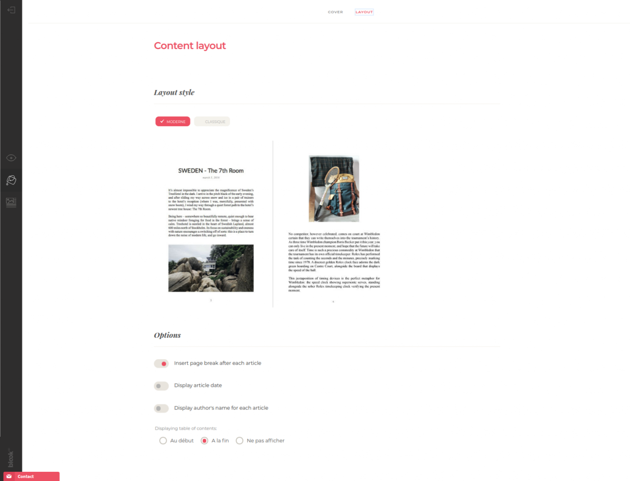 Our blook creation tool saves and applies your modifications each time you come back on your book's global preview via the icon