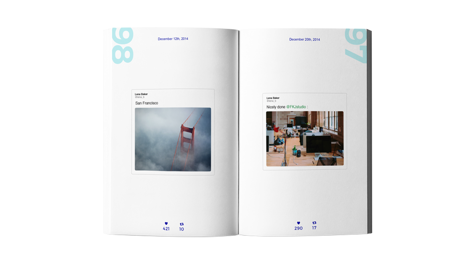This Twitter colours-inspired book will rank your tweets depending on the number of likes and retweets your community gave them, from 100th to 1st in order to keep the suspens alive until the last moment. Choose the period of time you want to rank the posts from, and we will automatically lay out for you the tweets (back as far as 3,200) your followers loved the most so you can have them saved and printed!