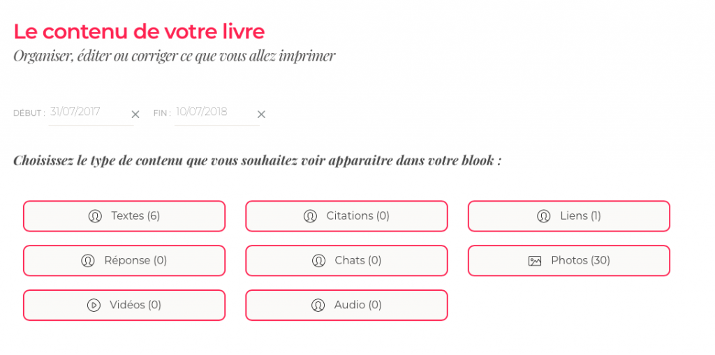 Le troisième bouton qui est « l’éditeur de contenu de votre livre », vous permettra de choisir les types de contenu à faire figurer dans votre »blook ». Vous pourrez choisir une période plus restreinte que celle choisie initialement. Vous pourrez également sélectionner le type de contenu (texte, citations, photos etc…) que vous voulez voir apparaitre dans votre livre, à l’aide des boutons suivants :