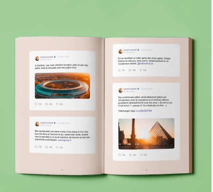 Avec son format compact (11×17 cm), ce livre papier de vos tweets entièrement personnalisables (couleur et photo de couverture de votre choix) vous offre donc la possibilité d’archiver, d’éditer et ainsi de prolonger la portée de vos tweets sur la période de votre choix.